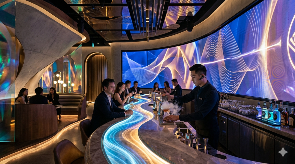 Ogni brand di bar ha un’identità luminosa coerente. Un whisky bar che punta sull’intimità e sulla tradizione usa candele reali o lampadine Edison a filamento visibile (1.800–2.200K), superfici che assorbono e diffondono. Un cocktail bar contemporaneo orientato alla sperimentazione può permettersi accenti cromatici controllati — non neon caotici, ma luce colorata integrata nell’architettura. La domanda giusta non è “che luce metto?” ma “che emozione deve produrre questo spazio alle 22:00 di un venerdì sera?” Il bar design 2026 parte sempre da quella risposta.